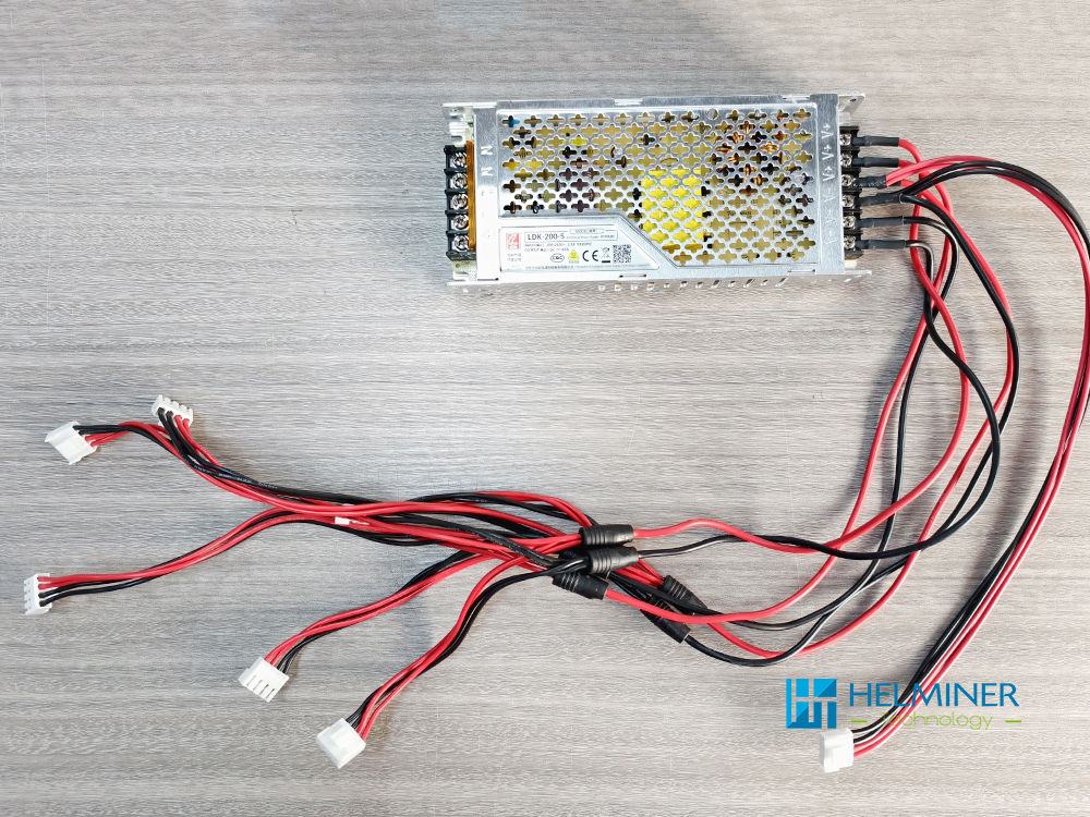 One power supply connects to three module power cables and one data card power cable.